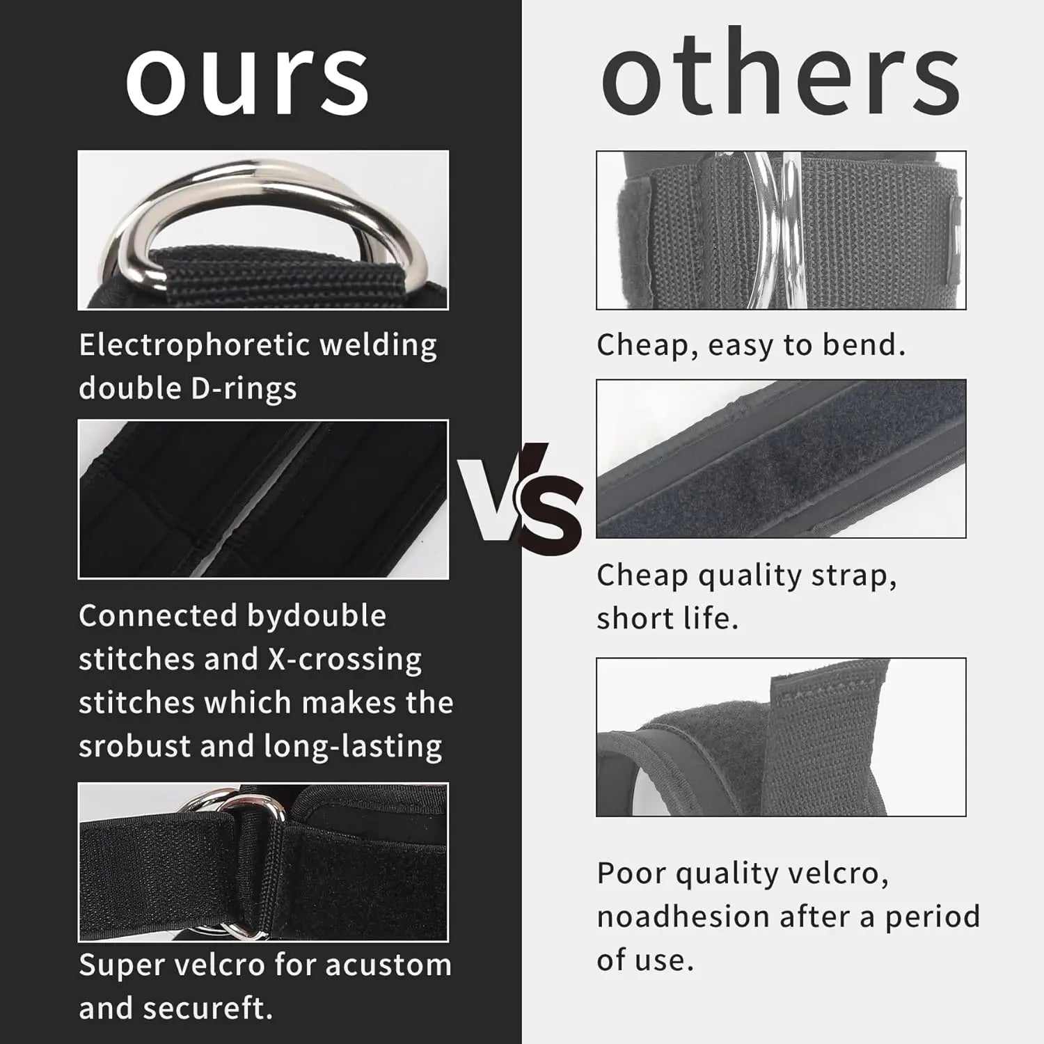 Heavy-Duty Comfort Straps Stop slipping and pinching. Our widened, padded ankle straps feature sturdy D-rings and a double-mouth design for uniform pressure. Train harder without worrying about chafing or loosening.